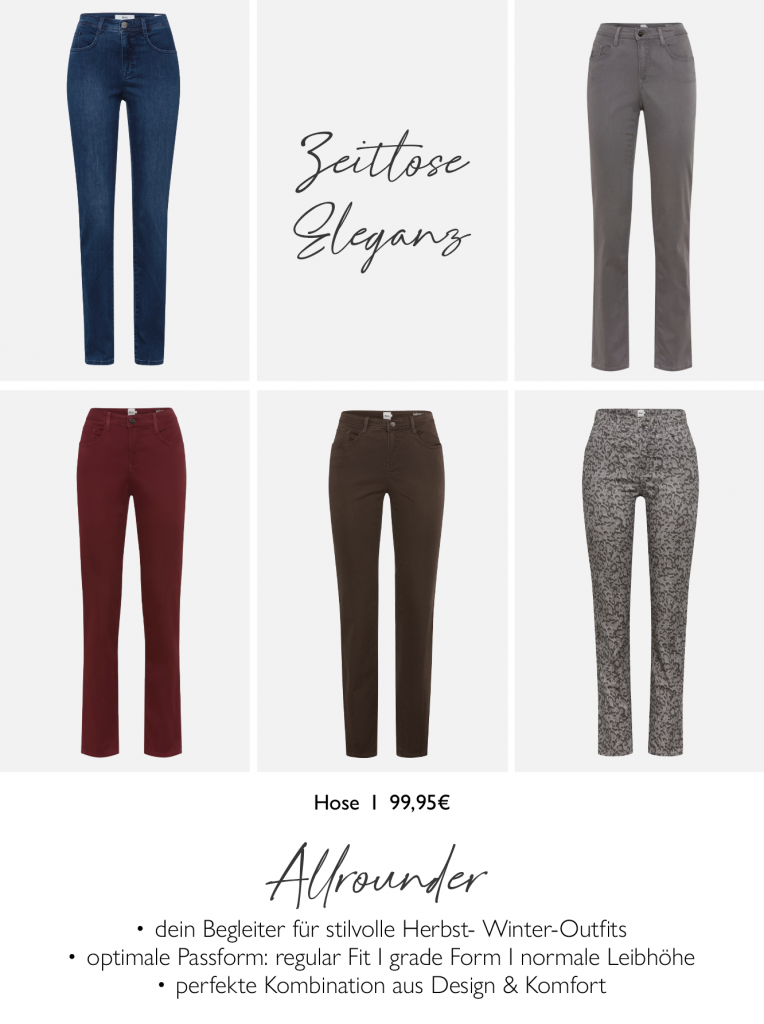 Du suchst Hosen, die wirklich passen und dich durch jeden Tag begleiten? Bei BRAX findest du die perfekte Form für deinen Style – ob lässige Denim mit Umschlag, elegante Bootcut oder die klassische gerade Linie. Dazu kombinierst du cosy Cashmere oder dein neues Lieblings-Streifenshirt. Alles so abgestimmt, dass du dich wohlfühlst!