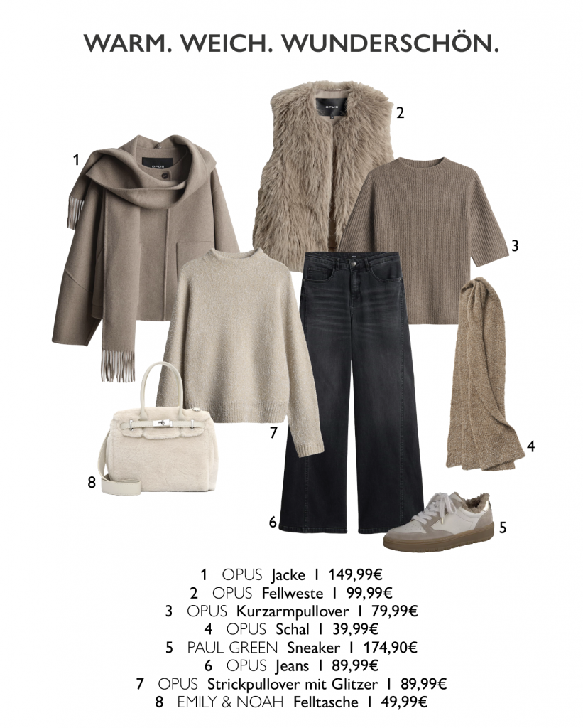 Der November wird kuschelig! Weiche Materialien, flauschiger Strick und luxuriöse Felloptiken bringen Wärme und Stil in deinen Look. Dezente Glanzdetails setzen kleine Highlights – perfekt für gemütliche Tage und stylische Auftritte zugleich.