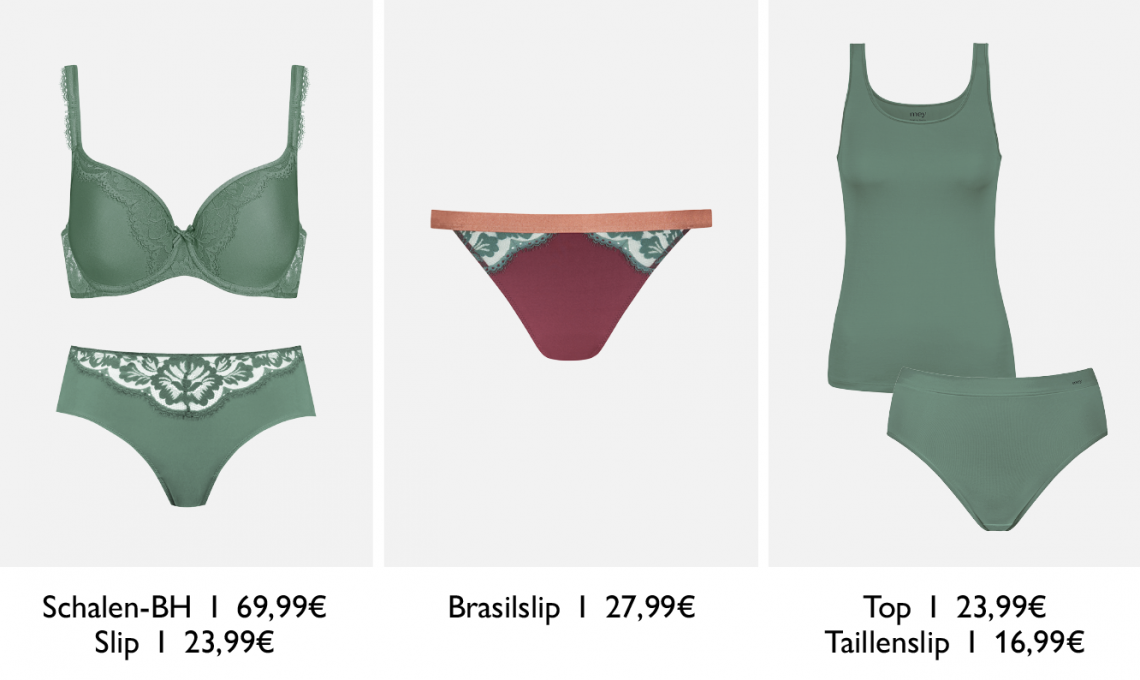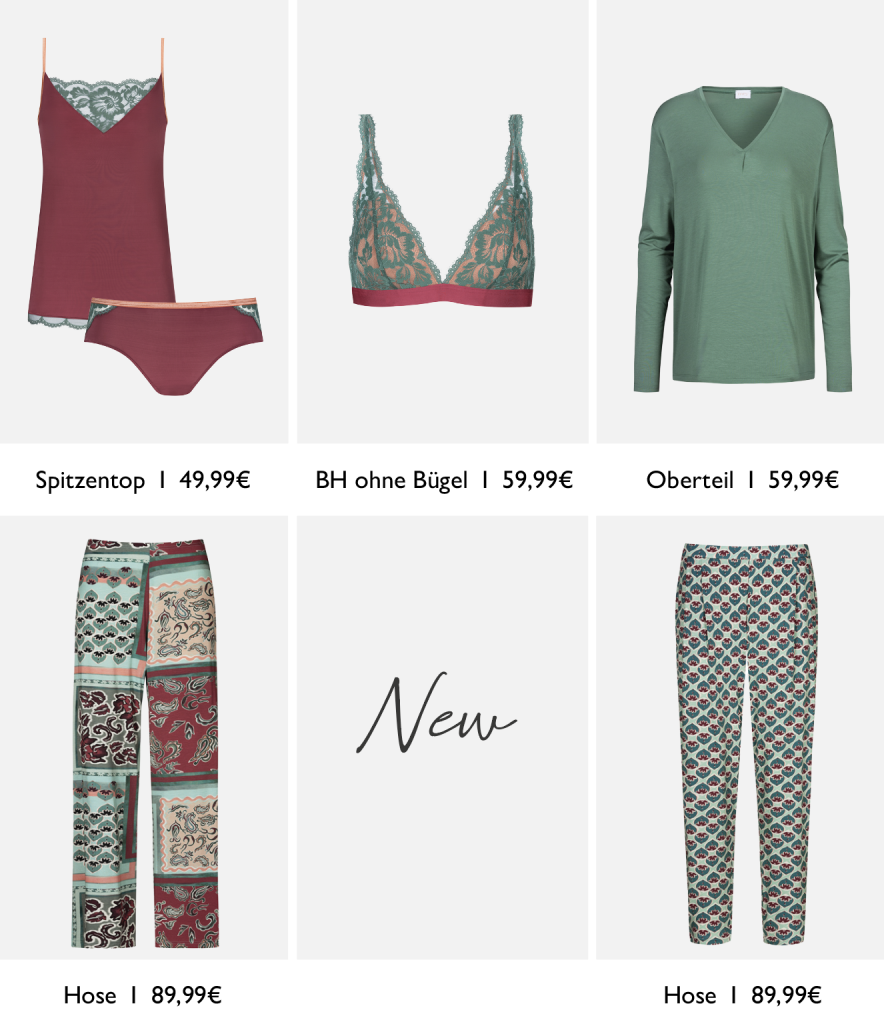 Zarte Stoffe, fließende Schnitte und ein Hauch Boho: Die neuen Styles von Mey verbinden edle Muster mit femininer Lässigkeit. Entdecke Tops, Pants und Lingerie in sanften Tönen von Satin Green, Bordeaux und Soft Rose – für Looks, die so sinnlich wie modern sind.