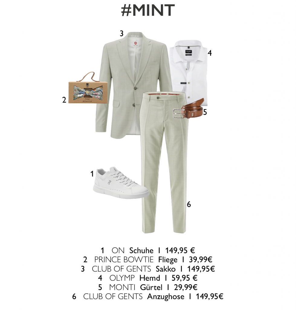 CLUB-OF-GENTS-Anzüge in Beige und Mint bringen Frische in einen klassischen Look. Klare Schnitte und helle Farben wirken modern und souverän. Abgestimmte Accessoires vervollständigen das Outfit zu einem harmonischen Gesamtbild.