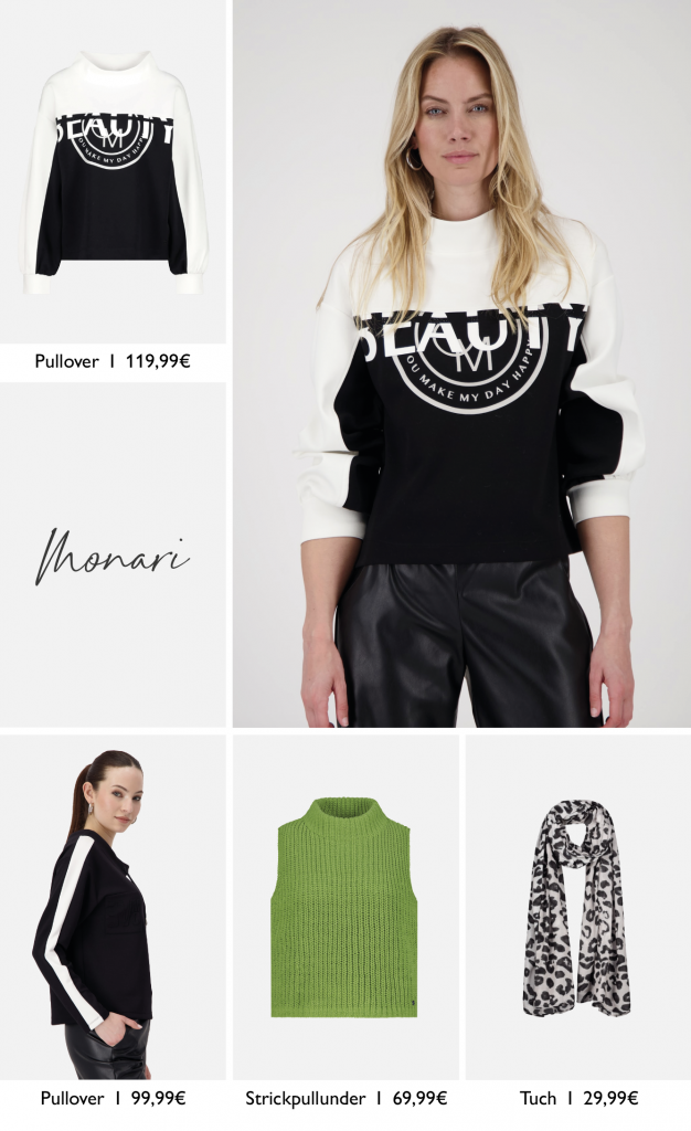 Statement trifft Alltag: Monari kombiniert coole Lederhosen, weiche Felloptiken und edle Grautöne zu einzigartigen Looks, die dich selbstbewusst durch den Tag tragen. Ob urban, feminin oder lässig – hier entsteht Stil genau da, wo Komfort auf Coolness trifft.
